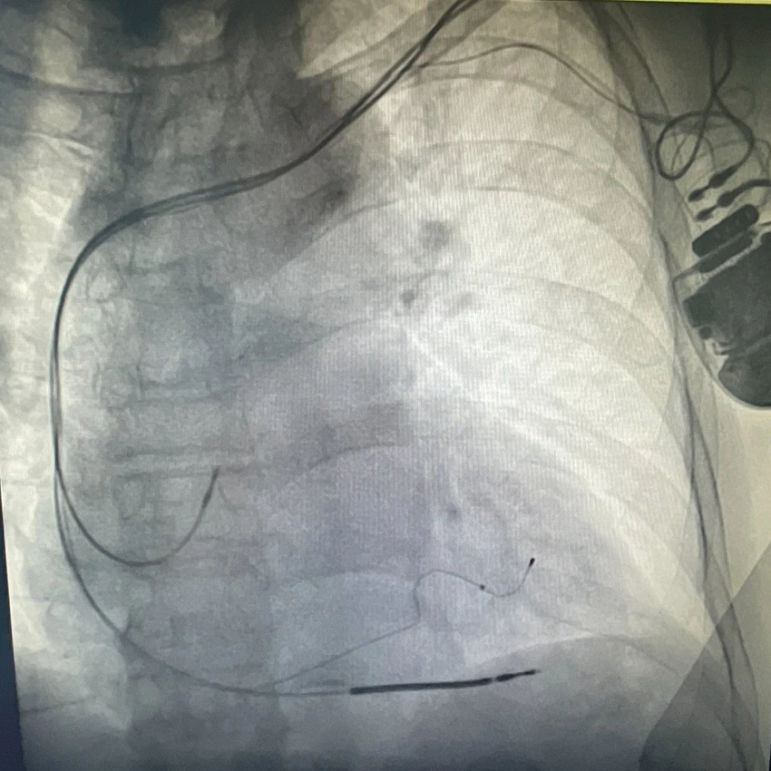 Die Röntgenaufnahme zeigt den implantieren Herzschrittmacher mit Defibrillator.