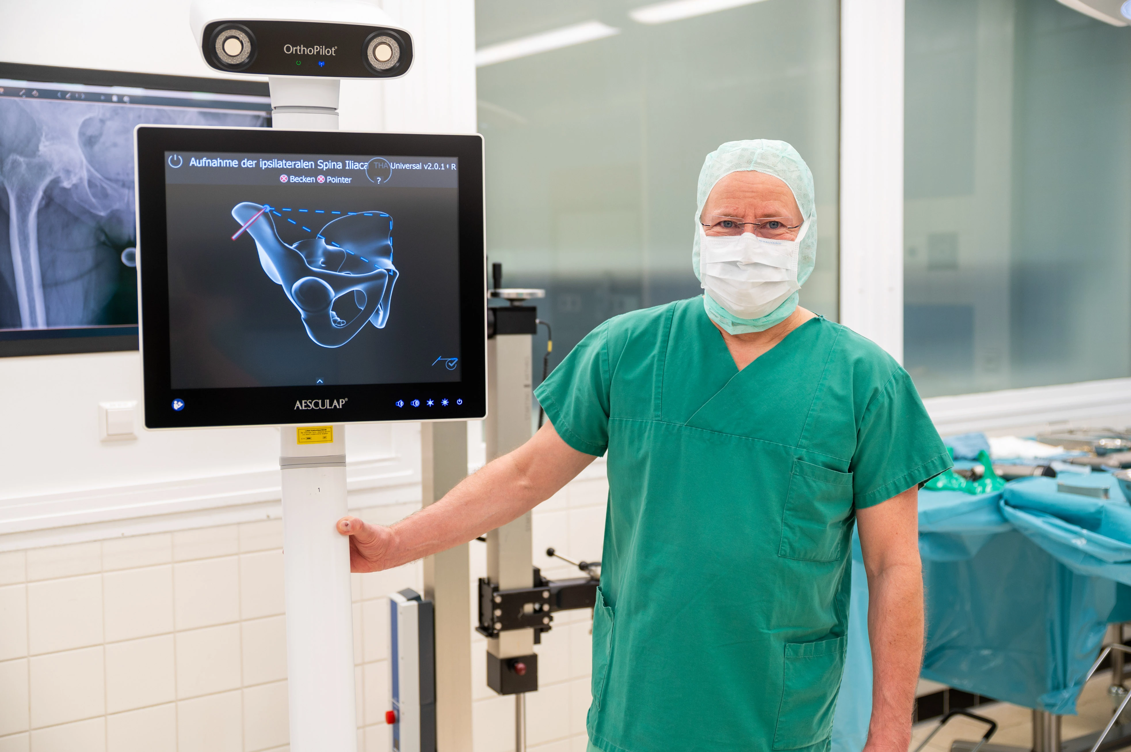 Der Orthopilot unterstützt die Operateure während des Eingriffs bei der präzisen Ausrichtung der Implantate. Das System arbeitet ohne Röntgenstrahlen und wird direkt während der Operation eingesetzt. Über Infrarotstrahlen, Reflektoren an den Extremitäten und eine Stereokamera wird die individuelle Beinachse erfasst. Die weiteren Operationsschritte erfolgen navigationsgestützt. Studien belegen, dass sich dadurch die Genauigkeit der Implantation verbessern lässt.